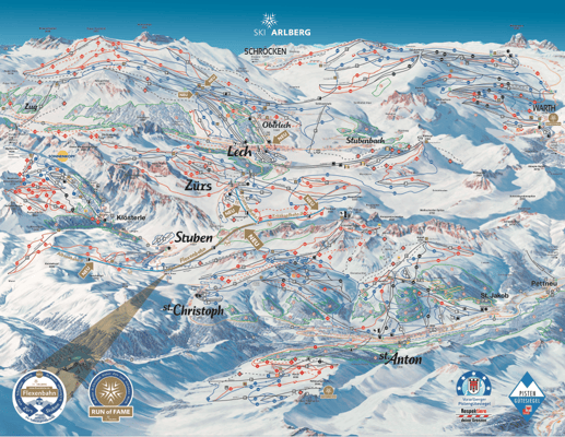 über Lech Zürs mit der neuen Flexenbahn nach St. Anton/Rendl im Süden wird somit das gesamte Skigebiet von Ski Arlberg abgefahren. Für eine solche Runde über den Arlberg, also zum Beispiel von